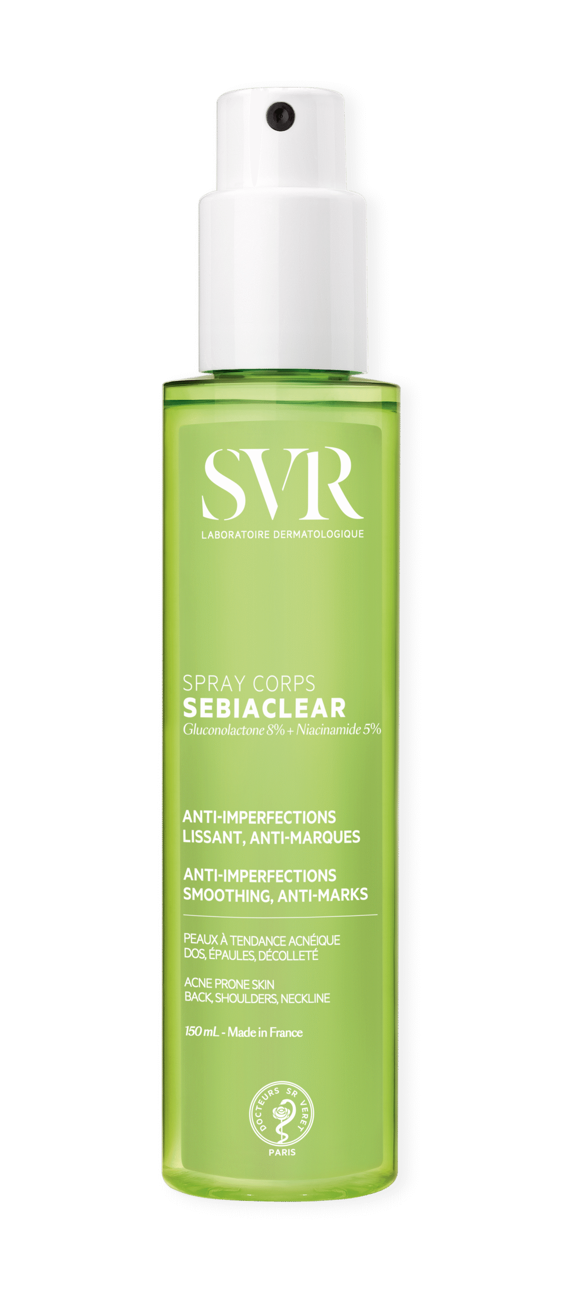 SEBIACLEAR Spray Corps | Formulé pour corriger toutes les imperfections du dos, des épaules et du décolleté. Sebiaclear Spray Corps, c’est -40% de boutons dès 2 semaines !1 Il réduit les imperfections et prévient leur réapparition, lisse le grain de peau & diminue les marques post acné.